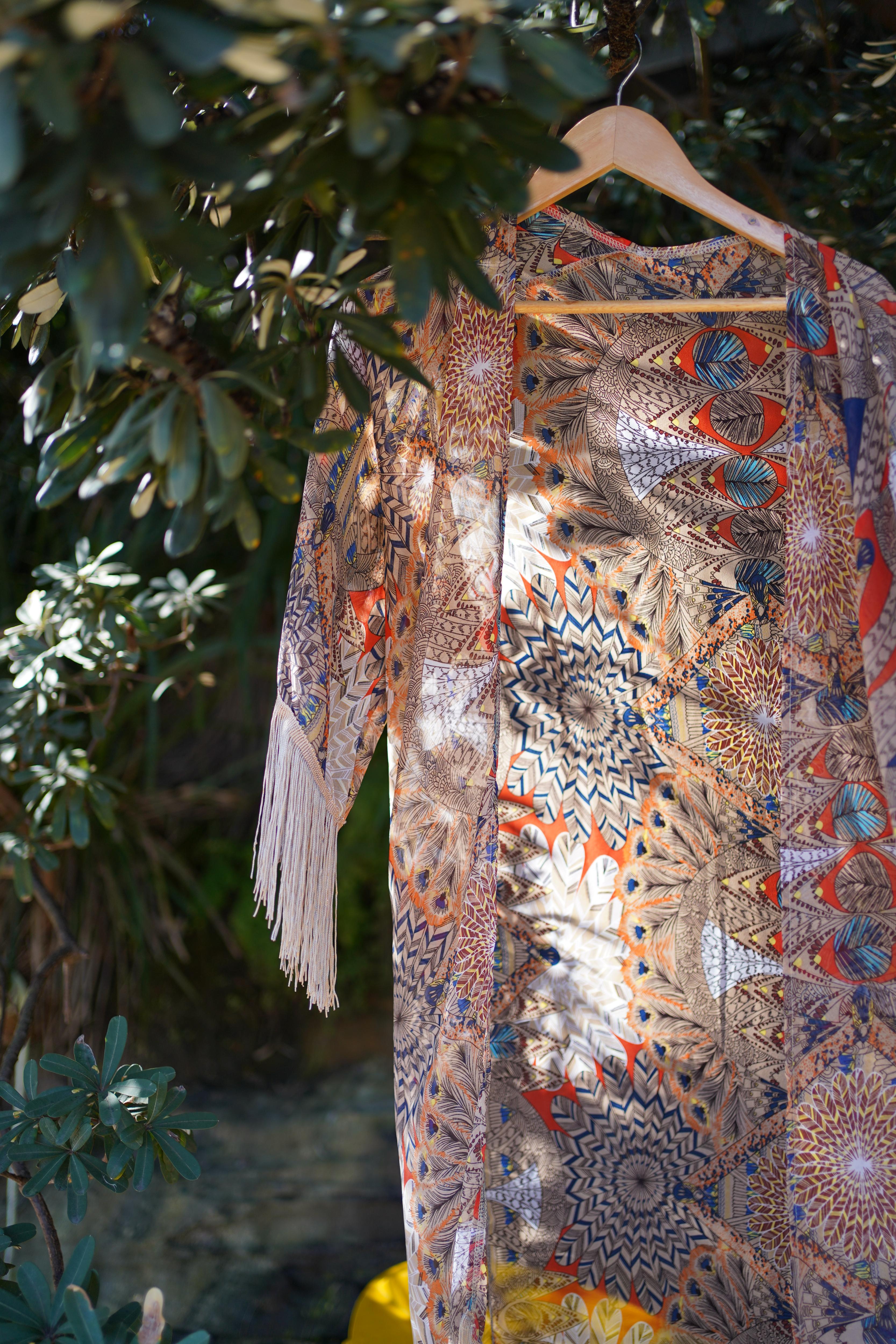 This ethereal piece features a stunning fusion of vibrant, earthy hues and captivating feather and foliage patterns. Delicate fringes dance along the sleeves and hemline, adding a touch of bohemian chic.